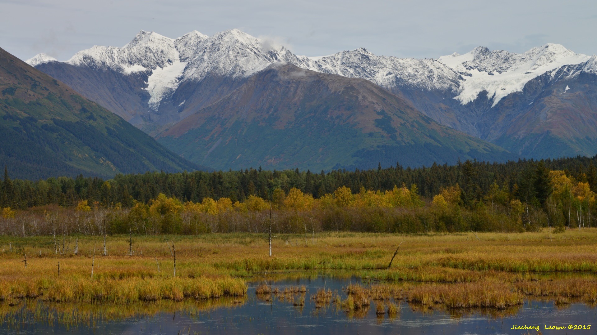 从地图上看,伸进安克雷奇(Anchorage)的海槽在这里分叉,劈成了南北两支,宛如螃蟹头前的两只大爪子。 在安克雷奇南面向东延伸的那一支海湾叫Turnagain Arm,要去的地方都在海湾北岸的山脚下。 出了安克雷奇沿着阿拉斯加一号公路往南行,海湾与群山就渐渐地展现在视野之中, 但总觉得景色与三年前春末夏初来的时候看到的有很大的不同。在观景台停下车来,眼前的海水浑浊不堪, 浅浅的海水遮不住下面的泥沙。放眼向对岸望去,连绵的群山上没有了白雪。三年前的春天经过这里的时候, 对面的山上到处都是白雪,在它的衬托下同样的海湾里碧波荡漾。这个季节,多数鸟类都已离去, 野生动物保护地显得十分寂寞,水溏里只有几只野鸭在游动着。